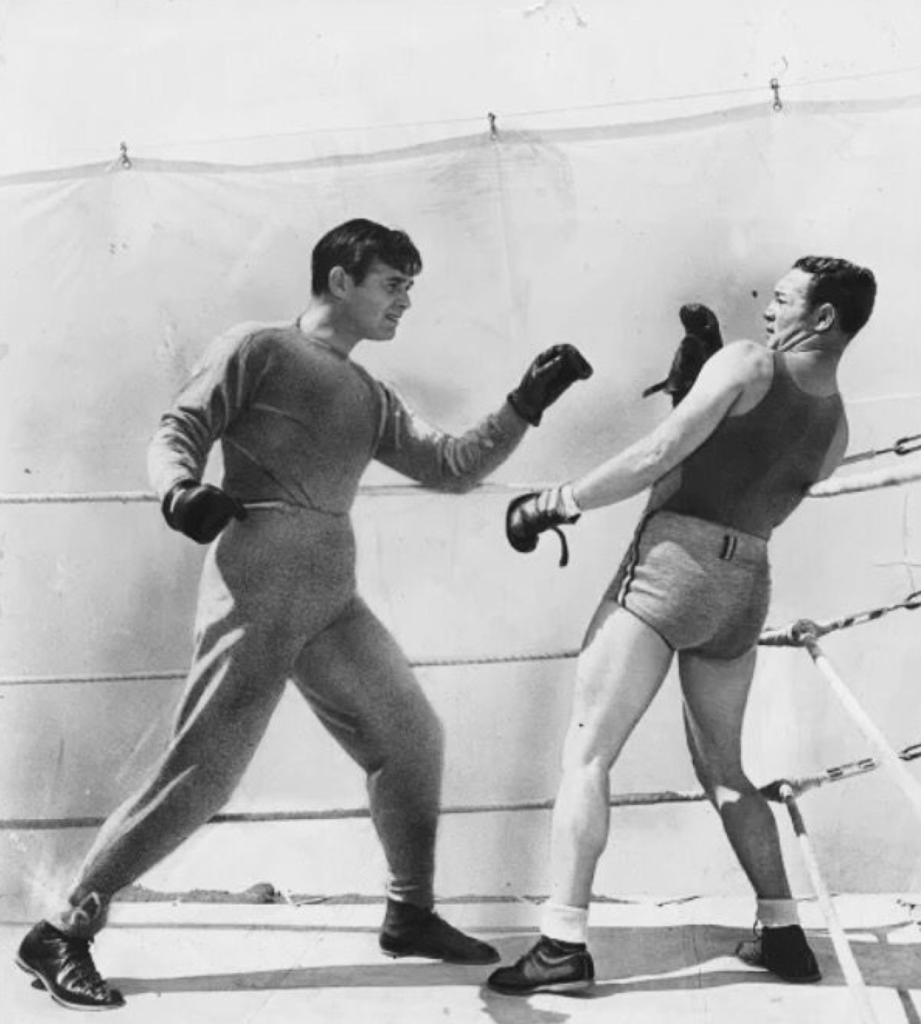 The famous knockout blow that Clark Gable delivered to his skilled opponent in the prizefight scene for “Cain and Mabel” will be retained in the picture, but will not appear as a knockout. Warners wanted to use it as the end of the 15-round bout in the story, in which Clark co-stars with Marion Davies, but the camera caught the “Round 1” marker above the ring, and there is no way to keep this from showing. As a result, the scenes will appear as a knockdown, and another way will be figured for Gable to score a kayo at the finish of the fight.