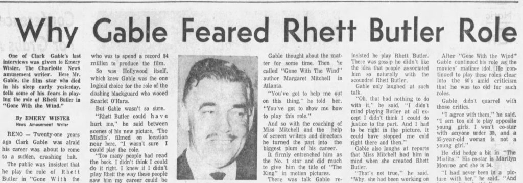 One of Clark Gable’s last interviews was given to Emery Wister, The Charlotte News amusement writer. Here Mr. Gable, the film star who died in his sleep yesterday, tells some of his fears in playing the role of Rhett Butler in “Gone with the Wind.”
